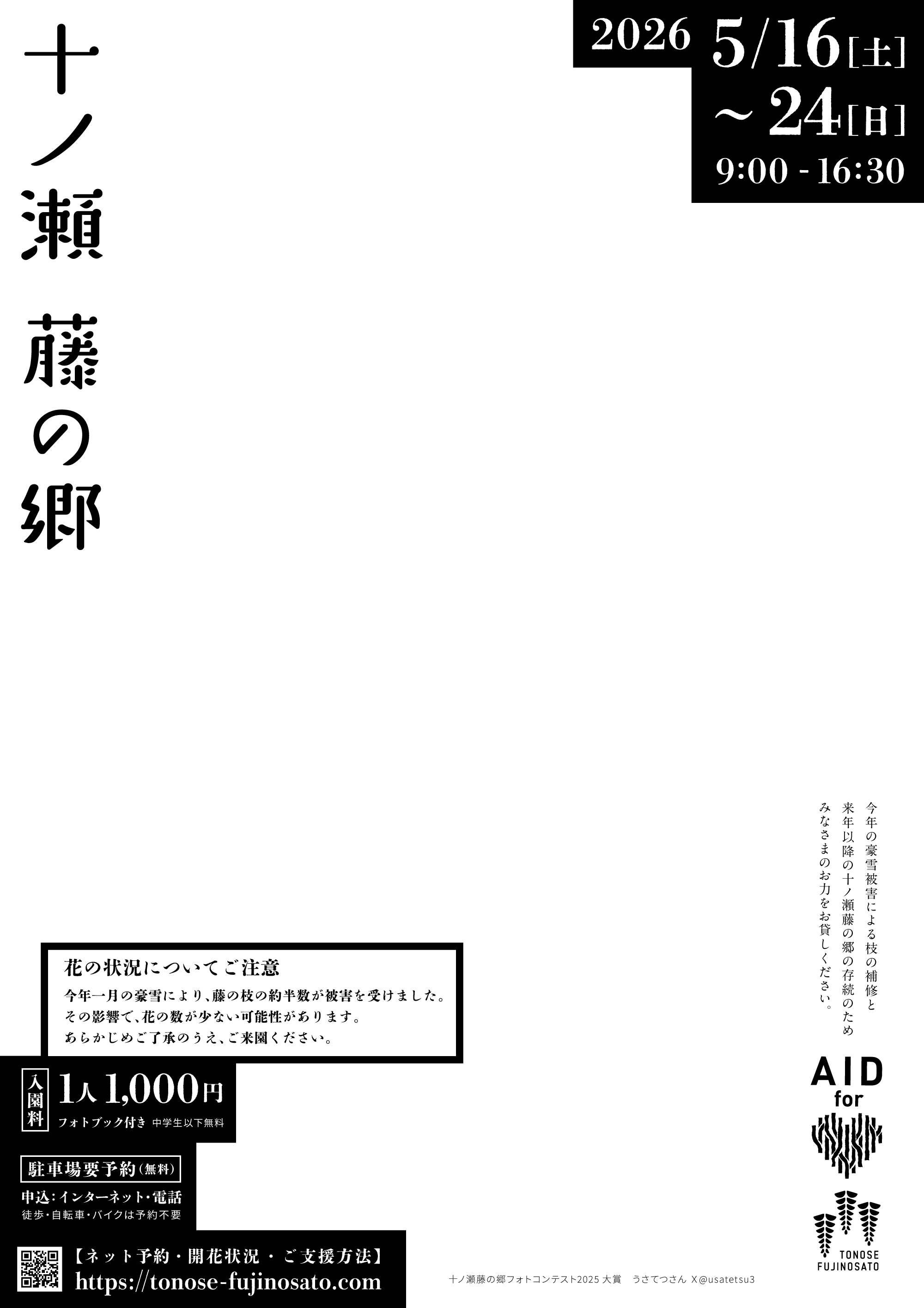 未来の藤の花を、守りたい。 十ノ瀬藤の郷では、今年一月の豪雪により藤の枝のおよそ半数が折れ、裂けてしまいました。それは、豊かで厳しい自然とともに生きる植物の宿命なのかもしれません。 今年はすでに花芽が育っているので少ないかもしれませんが、きっと花を咲かせてくれるでしょう。しかし、これからも藤の花が咲き続けるためには今修復しなければなりません。 みなさまのお力をお貸しください。 ...
