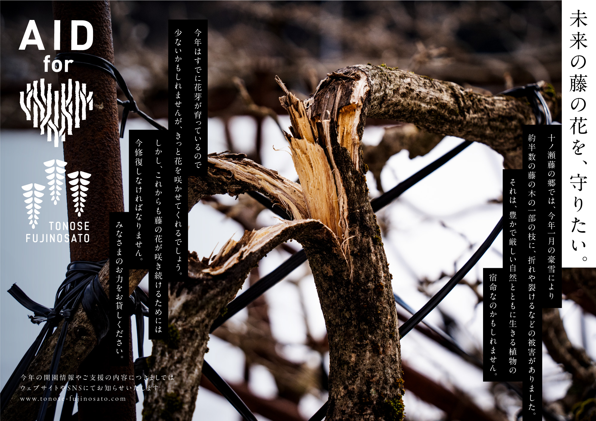 1箇所だけ折れたままの状態で残している箇所があります。被害の状況をぜひ見てください。また折れた状態で皮一枚で繋がっている木に花が咲くのかも観察したいと思います。
