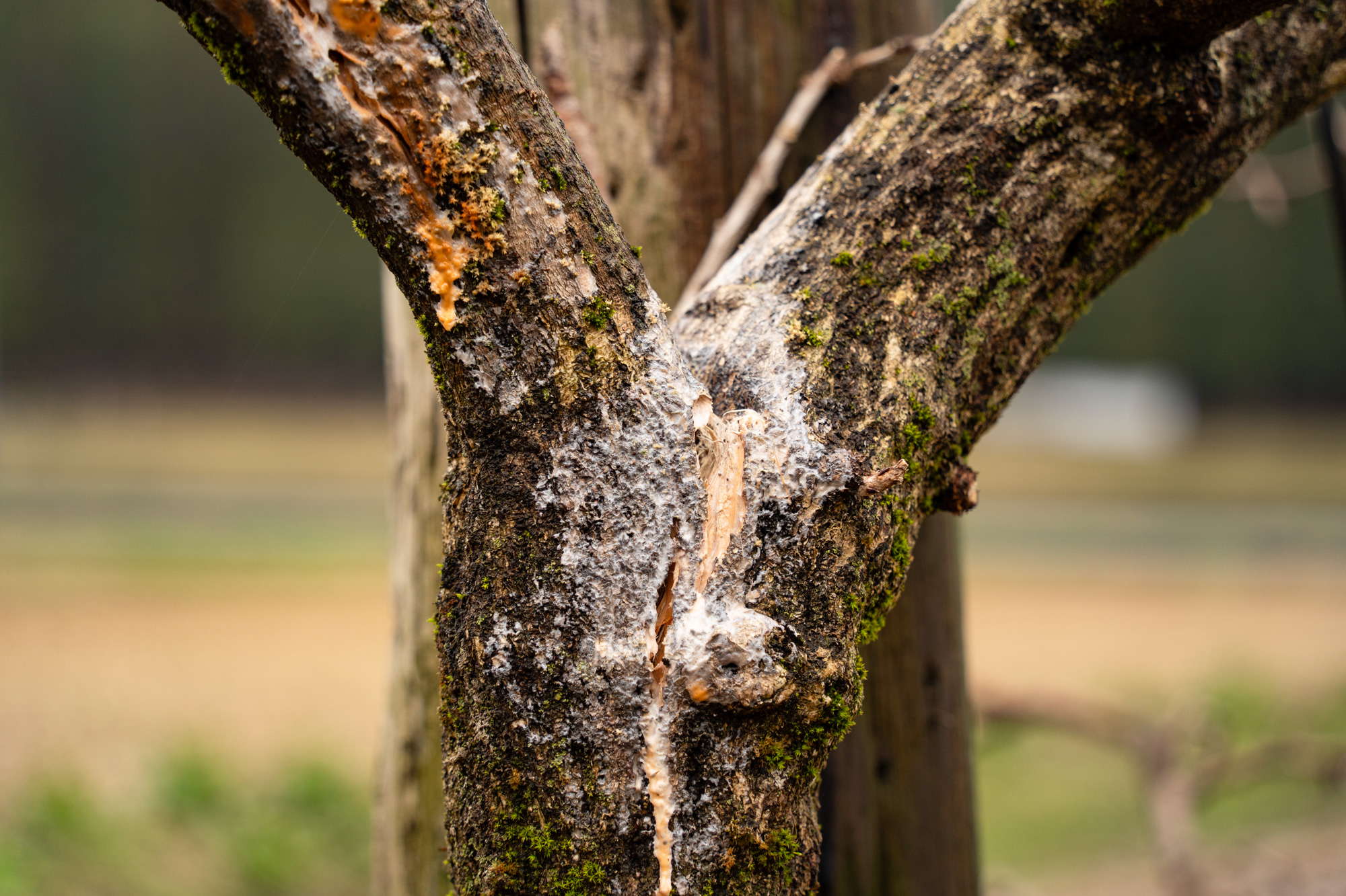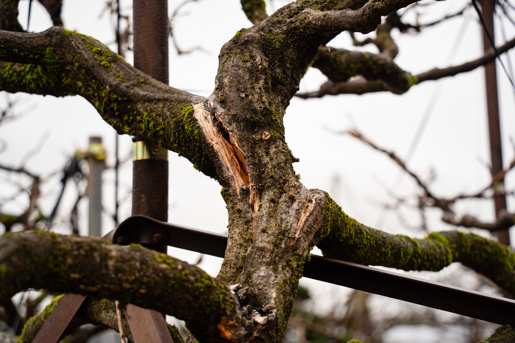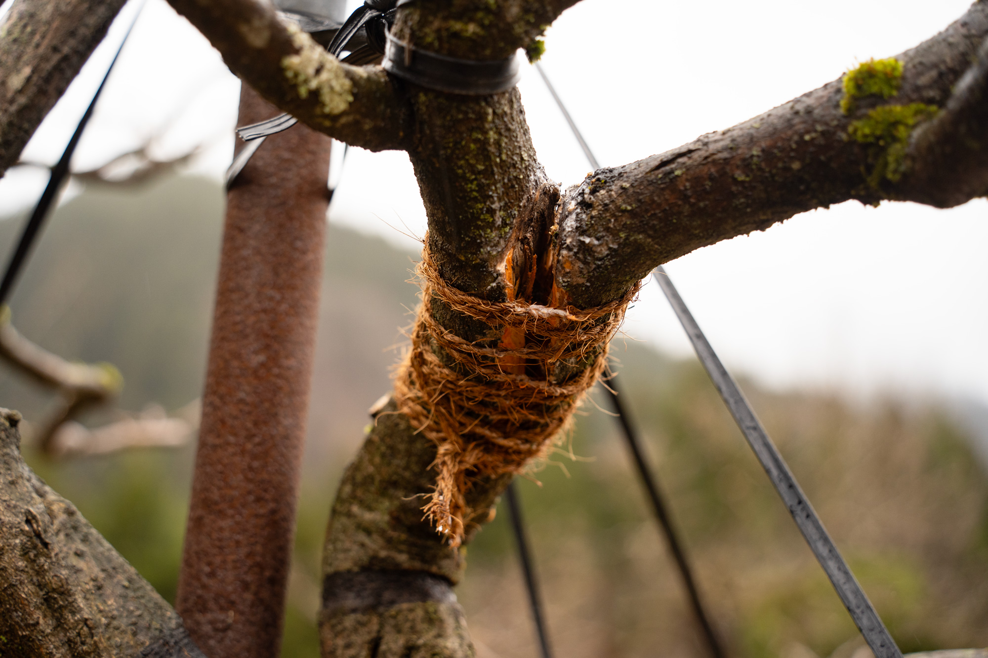 切り口の保護と治癒促進を目的に塗る癒合剤(ゆごうざい)を塗り、裂けた枝をくっつけるため縄でキツく縛ります。他には雪吊りのように上部から紐で引っ張り元の状態に戻しました。元々藤の枝は弱いので一部吊り上げていましたが、枝の高齢化もありこの補強はまだまだ必要だと考えています。